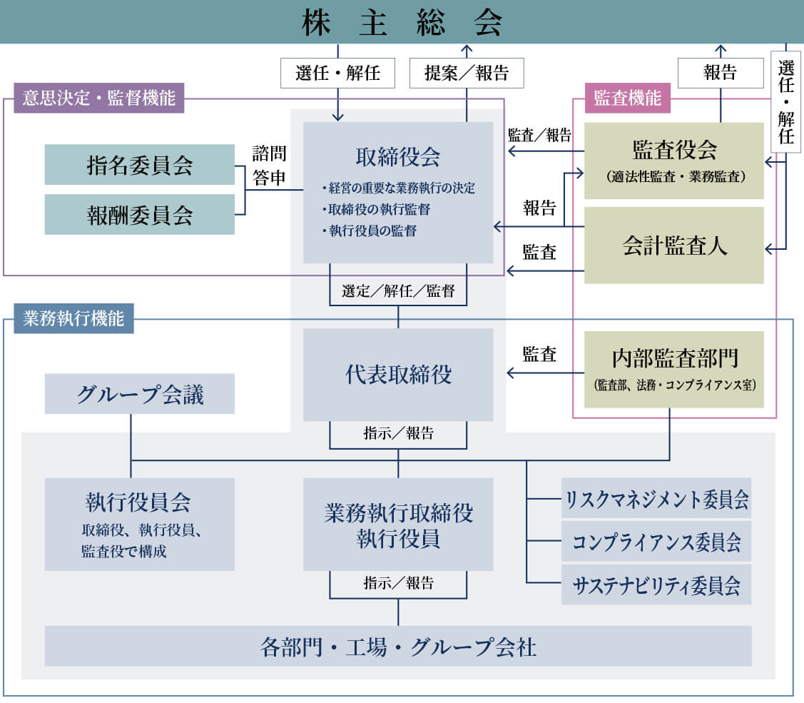 - 当社は、監査役制度を採用しています。監査役会は取締役の業務執行状況等の監査を実施し、ステークホルダーからの信頼に応える企業統治体制の構築に努めています。